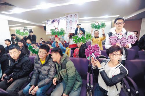 “等到王珞丹走到柱子這里,我們就喊口號(hào),看我手勢(shì)啊,數(shù)到2就開(kāi)始,大聲點(diǎn)!”從大連、海城、鞍山、丹東、錦州等多個(gè)城市趕來(lái)的“丹磁”(王珞丹粉絲昵稱)早早就趕到本報(bào)的見(jiàn)面會(huì)現(xiàn)場(chǎng)做準(zhǔn)備,他們中最小的今年剛剛上高中一年級(jí),大多數(shù)是二十歲左右的少男少女。一位“丹磁”告訴記者,他們聽(tīng)說(shuō)王珞丹腳受傷了,特意給偶像帶來(lái)了拖鞋、豬蹄、錦州烤雞,特別貼心。“準(zhǔn)備好,來(lái)啦來(lái)啦,唉……不是呀。”原來(lái)是本報(bào)記者從門(mén)口走進(jìn)來(lái),“丹磁”大呼白浪費(fèi)了一次感情。