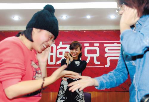 在新片《我愛(ài)的是你愛(ài)我》中,王珞丹和張涵予一段邊唱著經(jīng)典老歌《友誼花開(kāi)萬(wàn)里香》,邊互相敬禮、扇耳光的劇情,既搞笑又有愛(ài)——歌是大叔愛(ài)的老歌,但游戲形式卻流露出屬于小妞的活潑。這段戲極受“丹磁”們的喜愛(ài),以90后為主的他們不僅把這首老歌唱得滾瓜爛熟,更把它戲稱為“耳光歌”。昨日本報(bào)做客活動(dòng)的最高潮,就是王珞丹挑選兩對(duì)“丹磁”現(xiàn)場(chǎng)表演,而她則在身后唱起這首活潑的“耳光歌”。得知王珞丹親自參與這個(gè)環(huán)節(jié),現(xiàn)場(chǎng)“丹磁”們卻有些靦腆,王珞丹卻對(duì)兩組選手們說(shuō):“別羞澀嘛!你們靠我近一點(diǎn)!”貼心的王珞丹還特意講了一遍規(guī)則:“石頭剪子布,出一樣的敬禮,贏了的打輸了的——只能打手捂的那面,別太用力哦!”